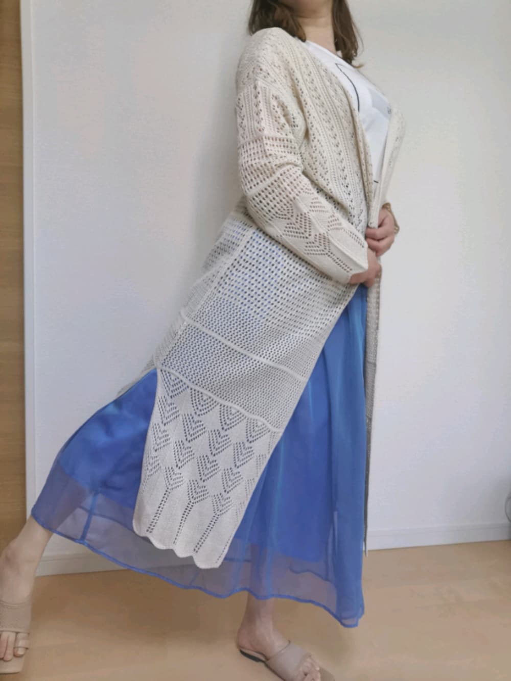 こんばんは。 日差しがとても暖かい1日でしたね。 羽織りは楽天で購入した透かし編みカーディガン。 これを羽織るだけで今年っぽくなります♪