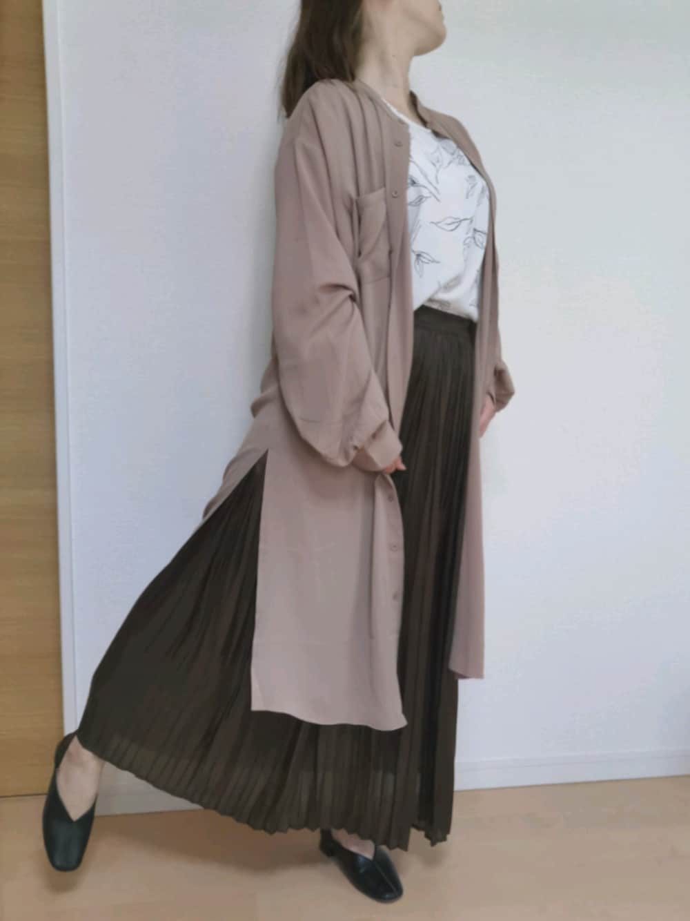 こんばんは。 久しぶりの投稿になってしまいました💦 今日は少し肌寒かったのでシアーシャツを羽織りました。 このHUG.Uで購入したアーモンドプードルカラーお気に入り♪