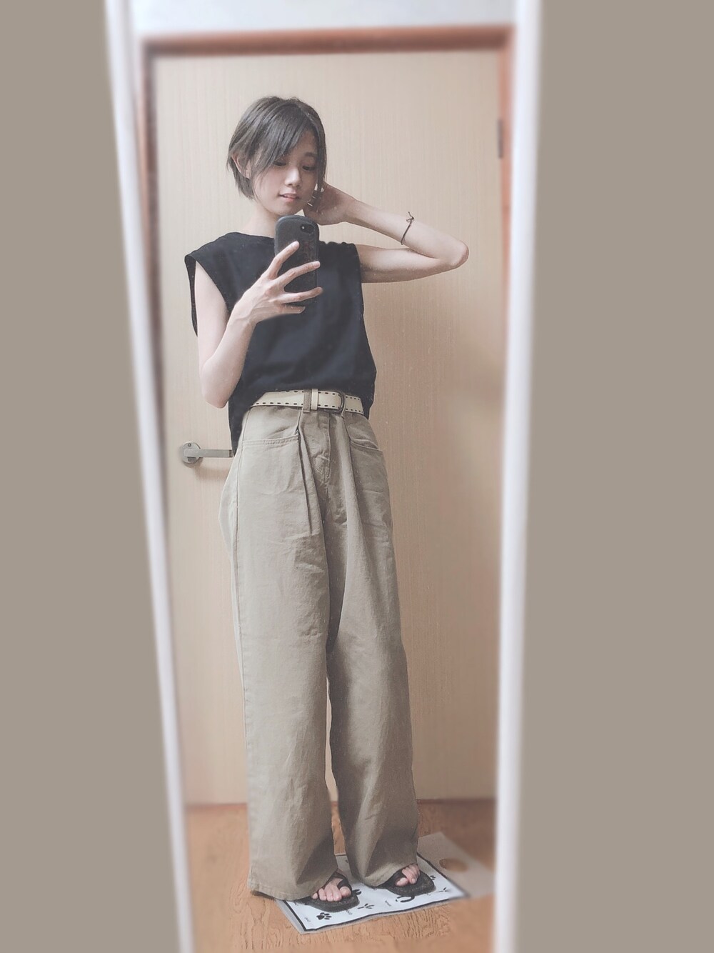 いつもありがとうございます! ノースリーブTとハイウェストチノパンツ ブラック×ベージュの組み合わせ好きです☺️
