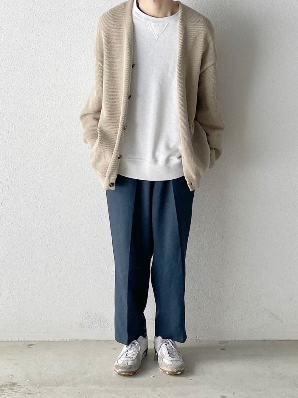 こんな格好じゃ外出られない笑 優しい色味がたまらなく好きです。 ベージュとネイビーの組み合わせ すごくいい。