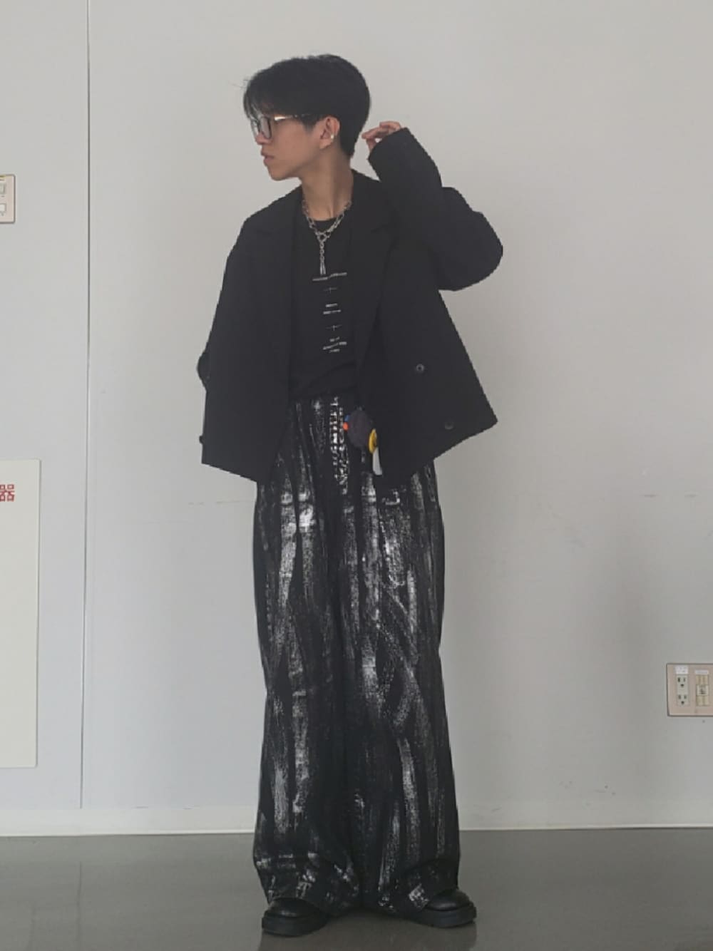こんなオールブラックコーデどうですか? ショート丈のダブルテーラードジャケット シルバーペイントデニム ラウンドトゥドレスシューズ オールブラックだけど、シルバーアクセサリーつけたり もはやパンツにシルバーを取り込むことで 重すぎない、ちょいクセありなコーデ完成🙌🏻🙌🏻 やっと秋っぽい気温になってきた🍁🍁
