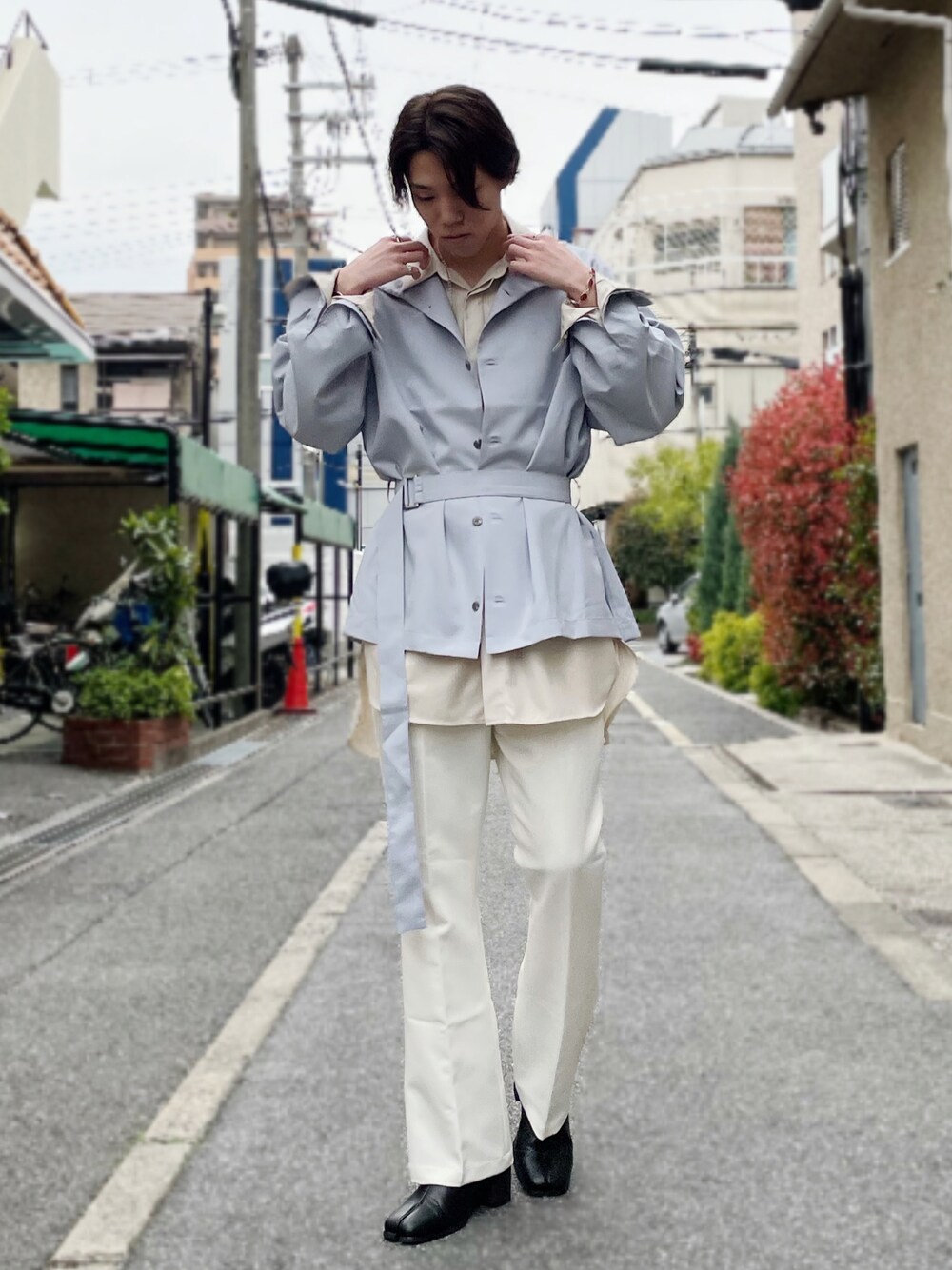 ko-ta(阿倍野キューズモール)のシャツ/ブラウス「◆Reflaxベルテッドスタンドシャツ(ユニセックスアイテム)」を使ったコーディネート