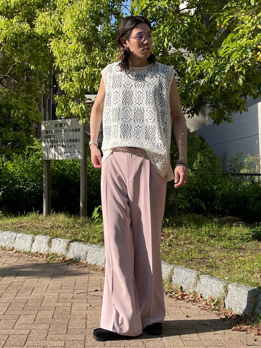 こんにちは! 夏に活躍するアイテムでスクエアレースはオススメです! カラーパンツで合わせてみました! 他のカラーやデニムなどにも相性抜群なので是非お試し下さい!