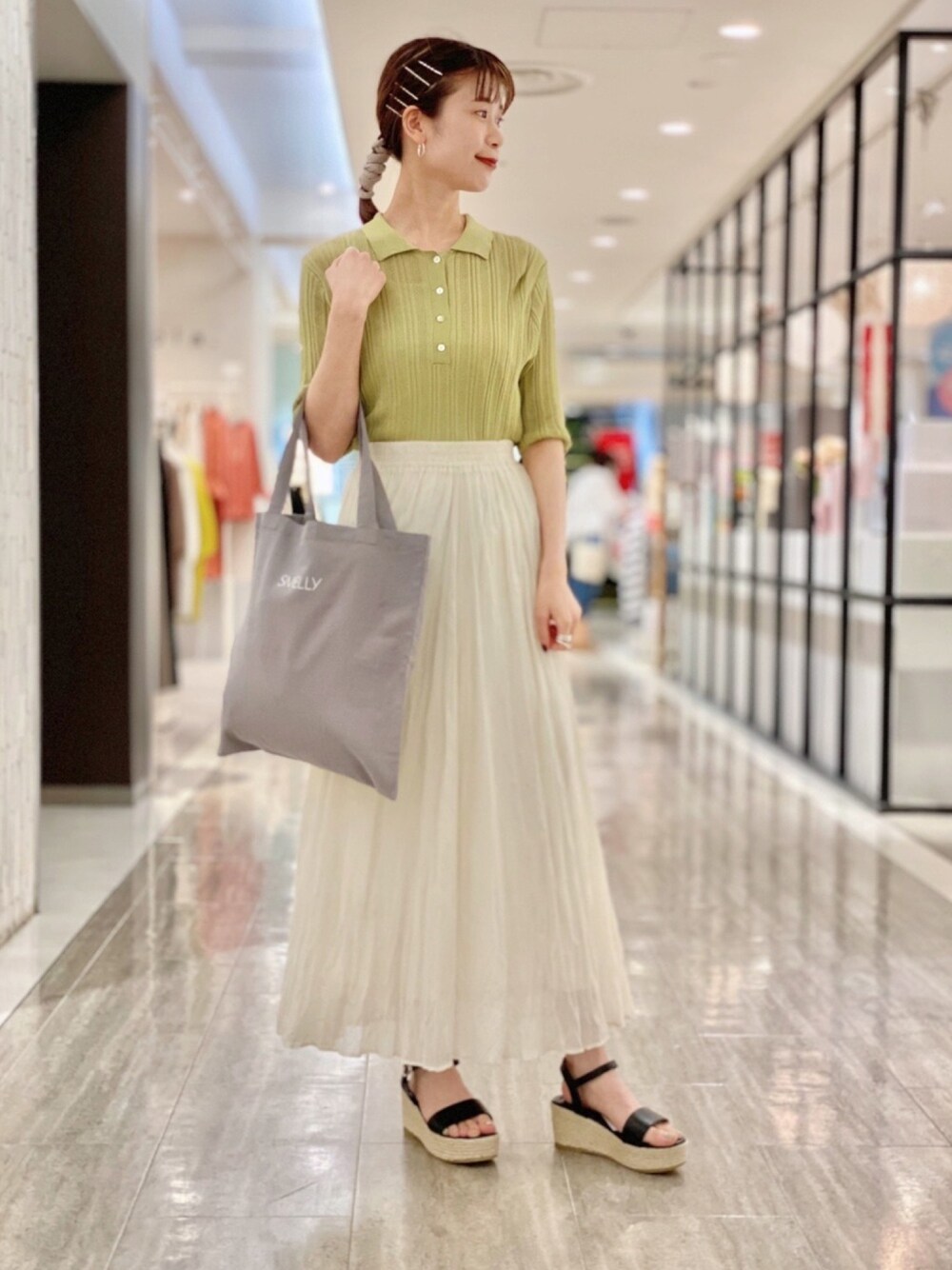 シアーポロセーターを使ったコーディネートです☺︎ イエローで爽やかにまとめてみました! ベーシックなポロ襟トップスですが、シアー素材で今年らしいデザインになっています! カジュアルなボトムからフレアスカートまで幅広く合わせられます♪
