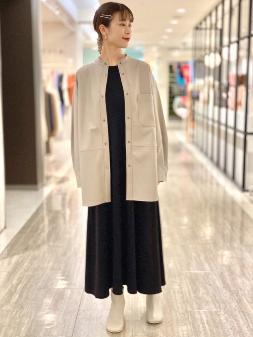 エコレザーシャツを使ったコーディネートです☺︎ ルーズなシルエットなのでフレアのワンピースとセットで合わせてみました! レザー素材ですが、ストレッチ性があるので羽織りとして使ってもとっても動きやすいです! ブラックと2色展開ですが、マイルドな印象で着れられるベージュもとってもおすすめです♪