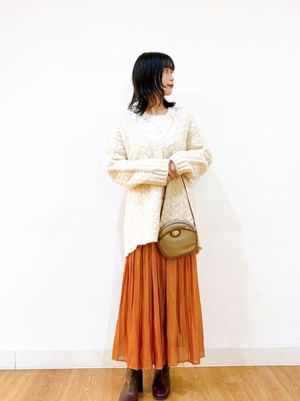 Vネックのケーブルセーターを使ったコーディネートです☺︎ ざっくりとしたVネックにチュニック丈のデザインになっています♪ケーブルデザインを強調した、シンプルなスタイリングもおすすめです!
