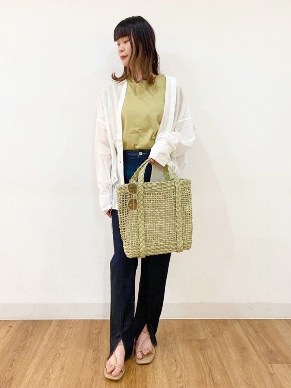 カラーTシャツを使ったコーディネートです☺︎ 人気のオーガニックコットンTアイテムの新色にイエローが登場しました♪ 今回はイエローをメインカラーにシアーシャツとデニムを合わせて、初夏にもおすすめのスタイリングにしてみました! 袖がフレンチスリーブのすっきりデザインになっているので、シャツなどを羽織に合わせてもかさばらず合わせられます☺︎
