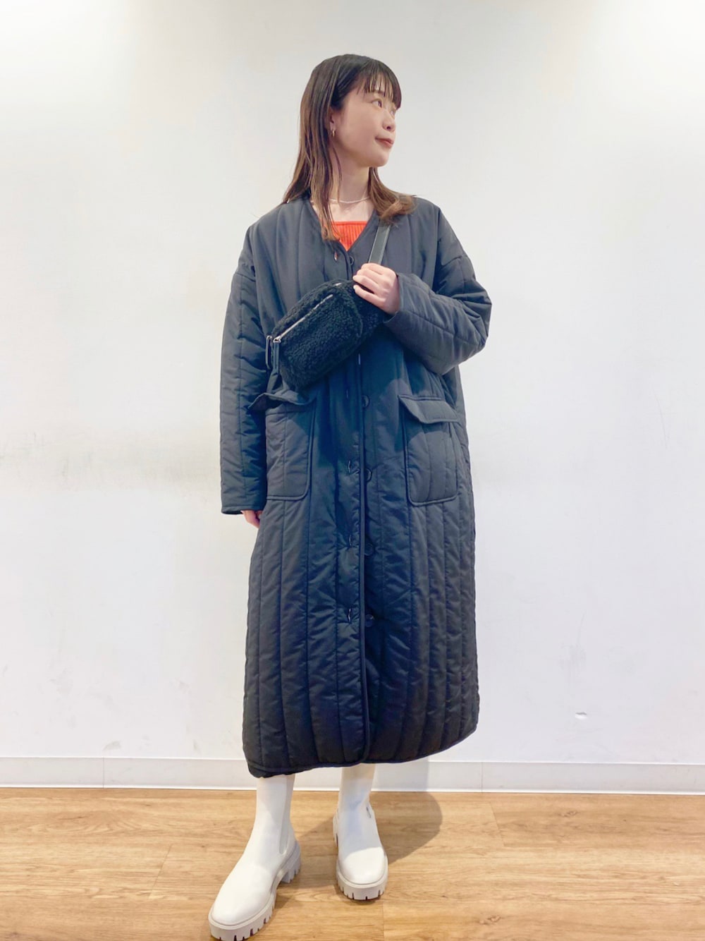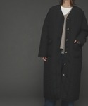 キルティングロングコートを使ったコーディネートです☺︎ インナーのカラーニットをアクセントにブラックでまとめてみました! パンツをサイドゴアブーツにインして履くことでよりカジュアルにスタイリングしてみました♪ 首元はノーカラーのスッキリデザインになってます♪ ふっくらした生地感ですが、軽くて暖かく、寒い時期にぴったりのロングコートです☺︎