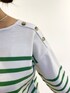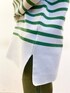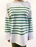 ボーダーニットを使ったコーディネートです☺︎ 爽やかなグリーンカラーがポイントのボーダートップスです♪ 今回はボトムもグリーンで合わせてみました! ゆったりシルエットの袖元と長めの丈感で、ゆるっとカジュアルに着ることのできる1枚です! 肩のボタンデザインも今年らしいアイテムです♪