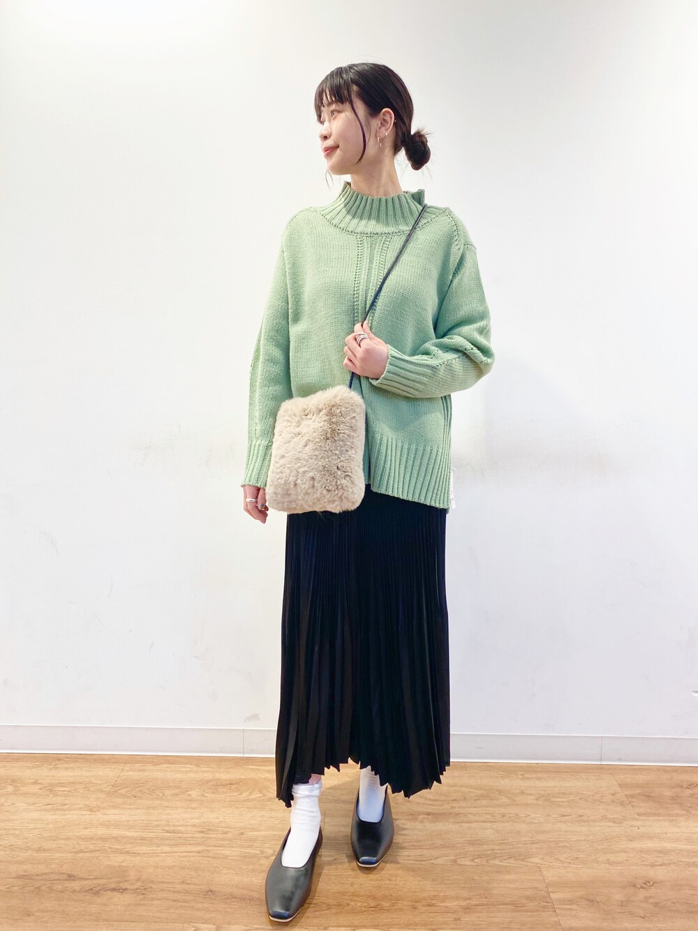ハイネックのニットプルオーバーを使ったコーディネートです☺︎ センターデザインがポイントのこちらのニットは、サイドスリットもあり着回ししやすいアイテムです! カラー展開も豊富にあり、カラーニットはコーディネートの主役としてもお使い頂けます♪