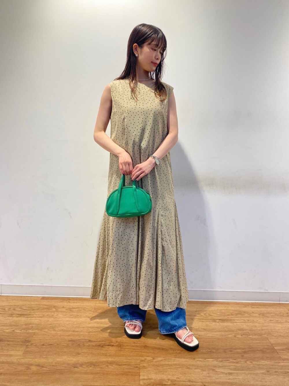 マーメイドシルエットのワンピースです☺️✨ 今回はドット柄を着用致しました! 小粒のドットデザインなので、可愛らし過ぎず大人な印象で着て頂けます♪ デニムと合わせてカジュアルなお出かけスタイルもおすすめです🧡