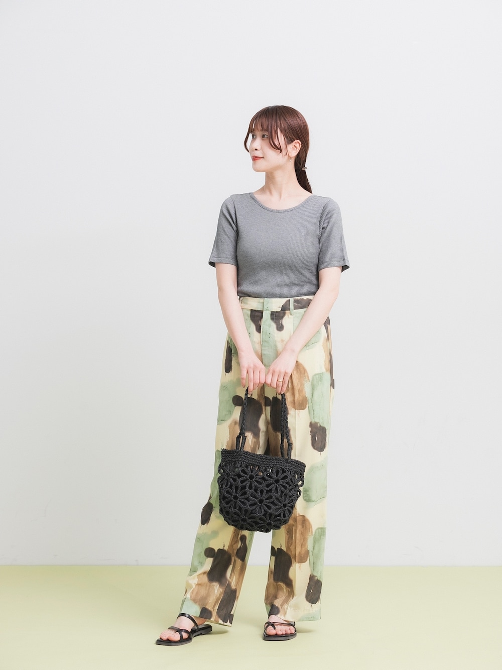 前後2wayで使えるリブトップスを使ったコーディネートです☺️ シンプルデザインなのでどんなスタイリングにも合わせやすいです✨ 今回は夏らしいプリントパンツと合わせてみました🎵