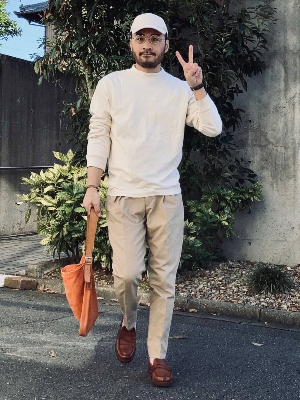 9月19日 朝 29/22℃ #ラブアンドピース2021 ピースをすると写真の雰囲気が壊れるし自分のキャラクターでもないので本当はやりたくないのですが平和を願う気持ちは持っているので善意で参加します。 せっかくなら良い人風にファッジの世界観でやろうと思いこのコーデにしたのですが世代が違うせいか普通のオジサン風になってしまいました。 一応ラブアンドピースが題材なので上質な素材と柔らかな色合いできれいにまとめてみました。