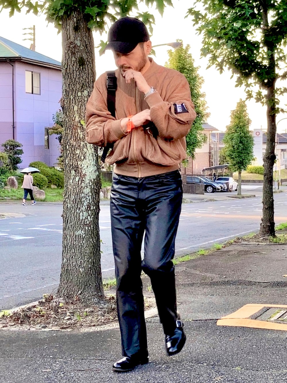 9月24日 早朝 30/19℃ スポーツミックス 早朝6時半に撮影したので気温20℃でした。 トップスはNIKEとundercoverコラボのMA-1にキャップ、 ボトムスはレザーパンツに革靴。 対照的なアイテムをミックスした秋コーデです。 パンツとシューズの色を統一するのは脚長に見せる定番テクニックですが、それに加え今回は短丈トップスの組み合わせ効果を狙いました。 ウエストのくびれがしっかり見えるようにパンツをいつもより下で穿いています。 文章で説明しにくいですがシルエットを美しく見せるポイントです。 ジャケットの裾リブから腰にかけてのタイトなラインはパンツのウエストラインを上げた途端に不思議なくらい冴えないシルエットになるので丁寧に最適なバランスを探し出しました。