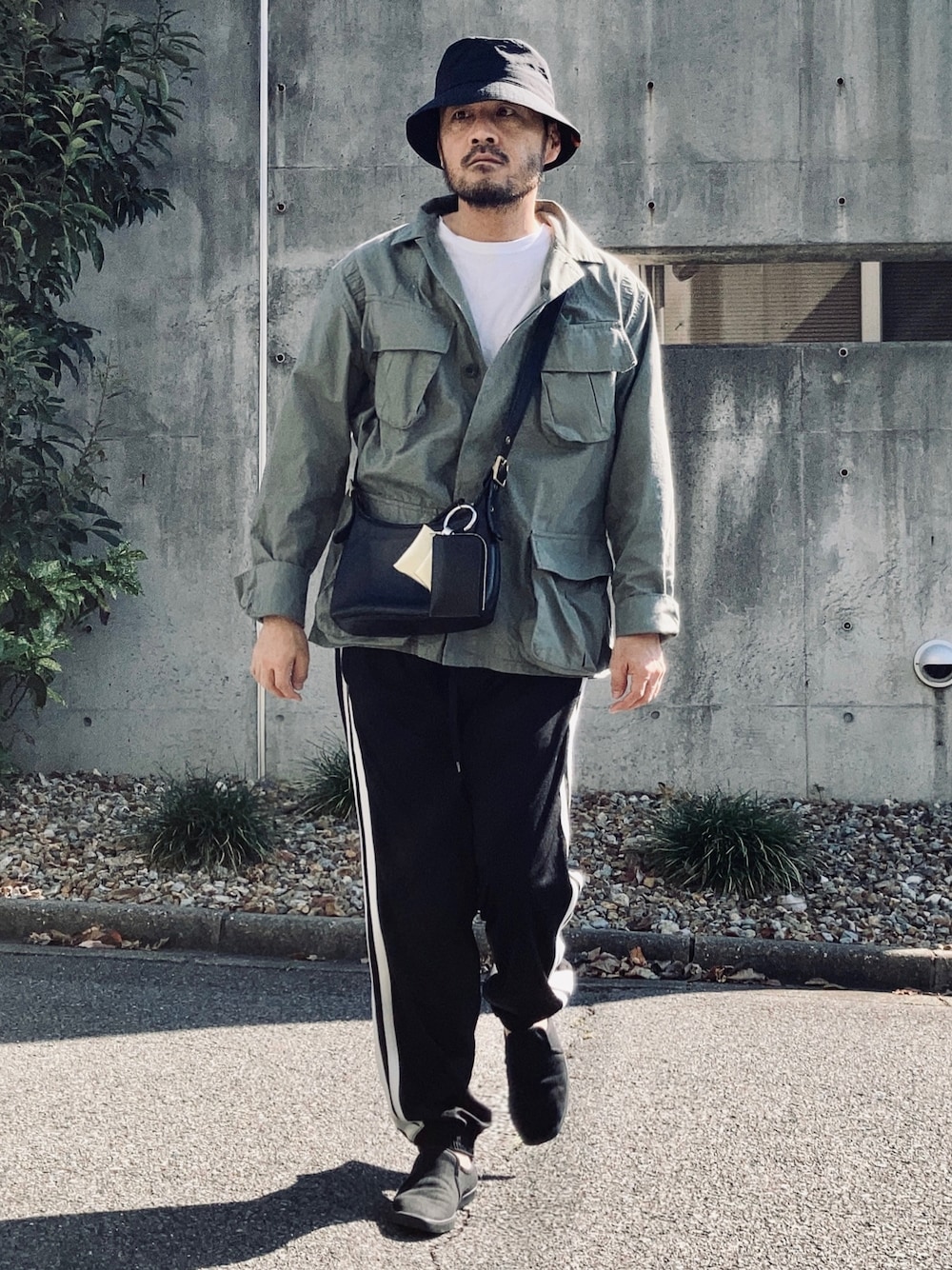 10月2日 午前 29/21℃ ラインパンツコーデ 休日、土曜の朝のコーディネートはいつもより丁寧に。 服はいつもの使い回しです。 過去のトレンド扱いされるトラックパンツをミリタリージャケットと合わせてテイストミックス。 ハットとバッグでドレスとカジュアルのバランスを整えて完成です。