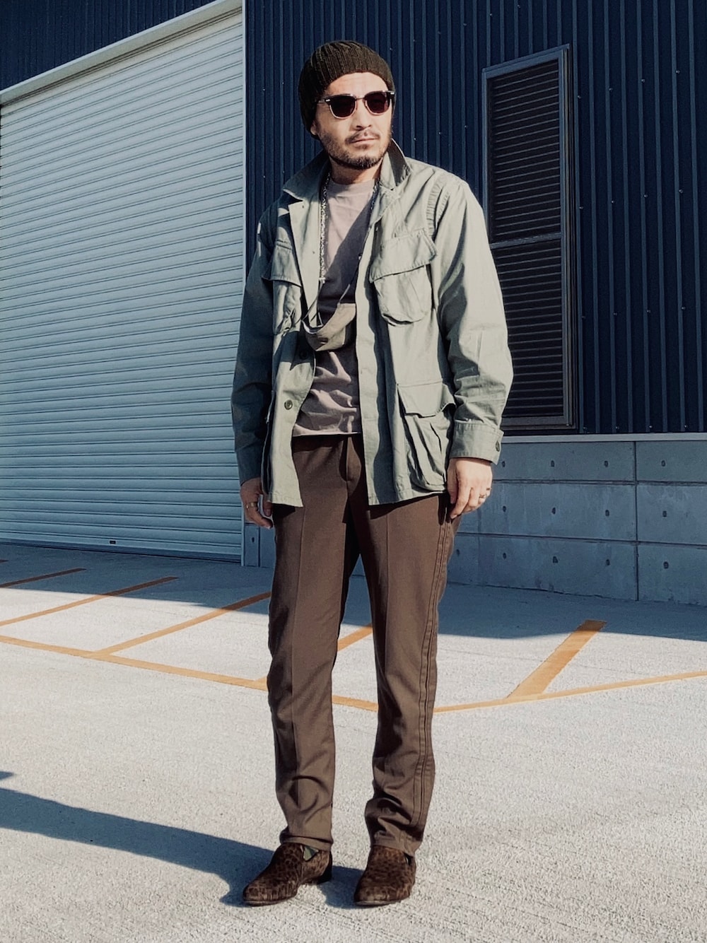 11月7日 朝 19/14℃ 外出用カジュアルスタイル ミリタリーアウターはスラックスと革靴でキメたスタイルに一気にカジュアルイメージを与えることができる便利アイテム。 写真のようにニット帽やサングラスを使えば誰でもPITTIのスナップ写真みたいな雰囲気を作れます。