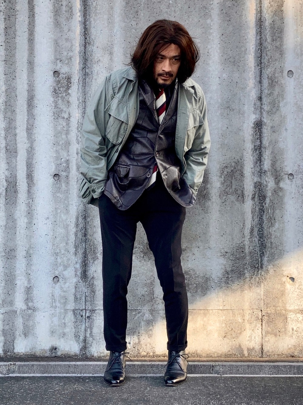 11月25日 朝 17/7℃ モッズスタイル スリムな3釦テーラードジャケットにナロータイ、 スキニースラックスにブーツ、 仕上げにミリタリーアウター。 60sのUKをイメージしてコーディネートしました。 いつも安易なスタイリングばかりしている自分への戒めです。 テーラードジャケットは20年前のもの。 ラムレザーのパッチワークデザインはノームコアが終焉を迎え装飾が台頭しつつある現在にマッチするデザイン。 シンプルキレイめやビッグシルエットからの脱却に最適です。