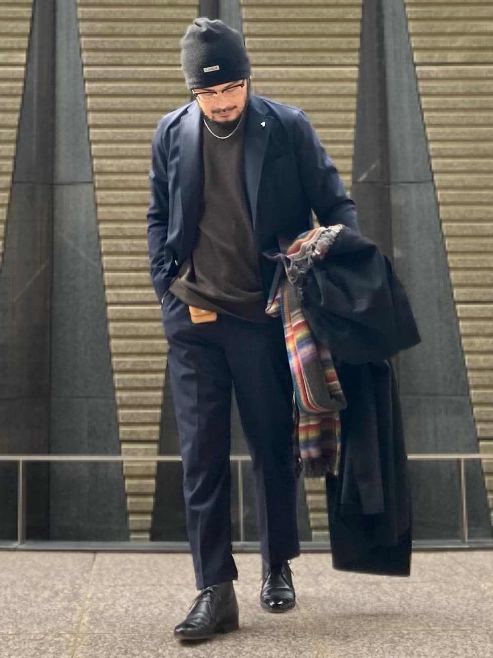 12月19日 午後 8/0℃ セットアップスーツ sophnetのセットアップ 仕事用で着たものをそのままインナーを変えて小物で装飾しカジュアル用途に変更。 奇をてらわず自然体のデザイン。 ルーズ過ぎずタイト過ぎず、普段使いに適した素材で丁寧に作られています。 フラップポケット、サイドベンツ、本切羽の2ボタンブレザーですが肩パッドなしで着丈も短め。 スラックスと合わせるとちょっとカジュアルですが濃紺なのでインナーの種類や小物類でドレスとカジュアルの調節が可能です。 ビジカジ二刀流を期待して奮発しました。