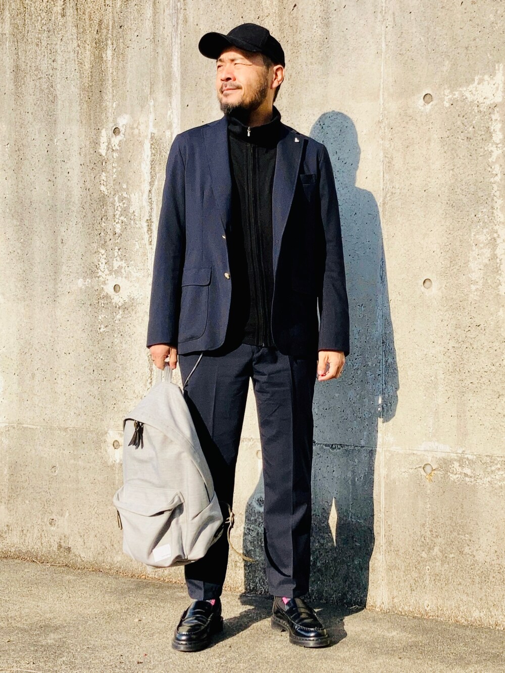 12月21日 午前 13/3℃ セットアップスーツ キメすぎにならないようにドレス要素を含んだカジュアルアイテムを合わせています。 ファスナー付セーター(でもウールニット) キャップ(でもスエード風素材) リュック(でもレザーパーツあり) 厚底ローファー(でも本革) 細かいですがファスナーやバックルなどの 金具の色は全てシルバーで統一しています。 ニット(アニエスベー)のファスナーはriri製、実はスラックス(soph)のファスナーもriri製。 偶然ですがこういう細かいところが妙な満足感につながります。
