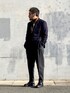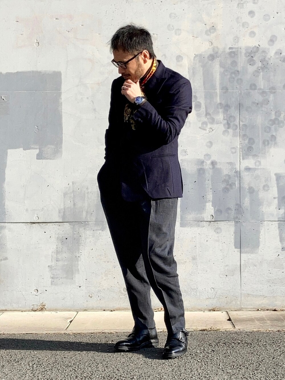 1月16日 朝 10/-1℃ 古着でドレススタイル 過剰生産の世界で生きているならわざわざ中古品を選択する理由はないかもしれません。 でも過剰生産ではこれからの時代を生き抜けません。 過剰生産を是正するためにも消費者は中古品を利用しない手はないと思います。 過剰生産故に良いものが良い状態のまま中古市場に溢れています。 利用する価値は十分にあります。 今日のメインアイテムに中古品を使っています。 インナーのハイゲージニット、テーラード ジャケット、スラックス、そしてポイントのスカーフ。 古着と思われることはないでしょう。 着こなしのポイントは装飾です。 ネイビー×グレーの一般的ジャケパンスタイルに派手な色柄のスカーフ、腕時計、ダブルモンクの革靴を合わせてラグジュアリー感を加えています。