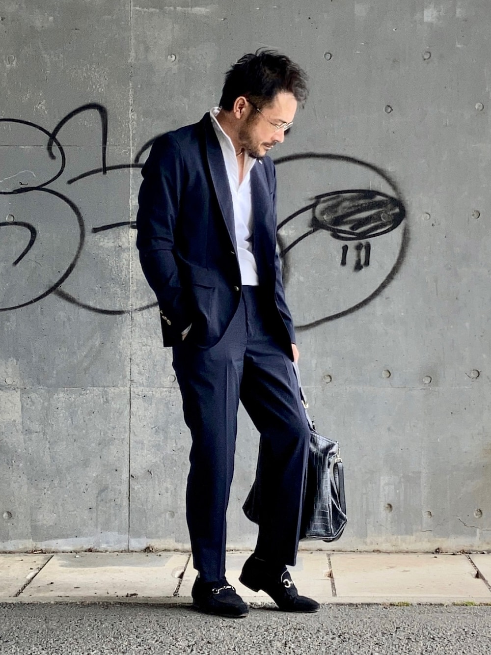 4月4日 昼 19/10℃ イタリアン クラシコとは言えませんがセットアップスーツにイタリアンカラーのポロシャツを入れ、レザーバッグとスエードローファーを合わせてイタリア色を濃くしました。 ほとんどやらない組み合わせですがたまにやると新鮮です。 私の日常ではセットアップスーツを着ることはほぼないのですがこれならビジカジスタイルでも行けそうです。 ジャケット脱いだ時の写真は後で掲載します。