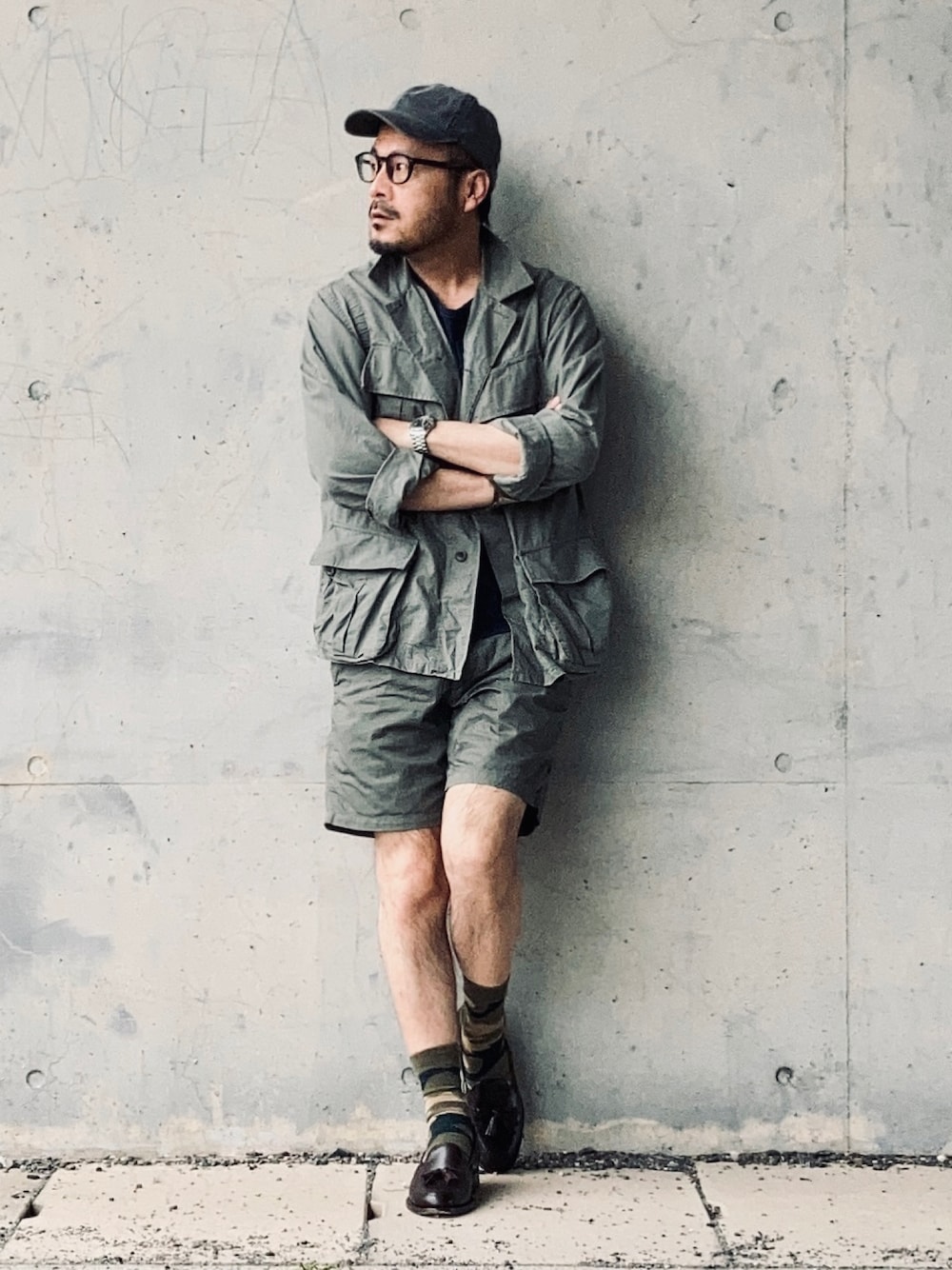 5月9日 朝 19/12℃ ミリタリースタイル ファティーグとショーツをセットアップ風に合わせました。 ミリタリーすぎないようにロゴTとローファーをチョイス。