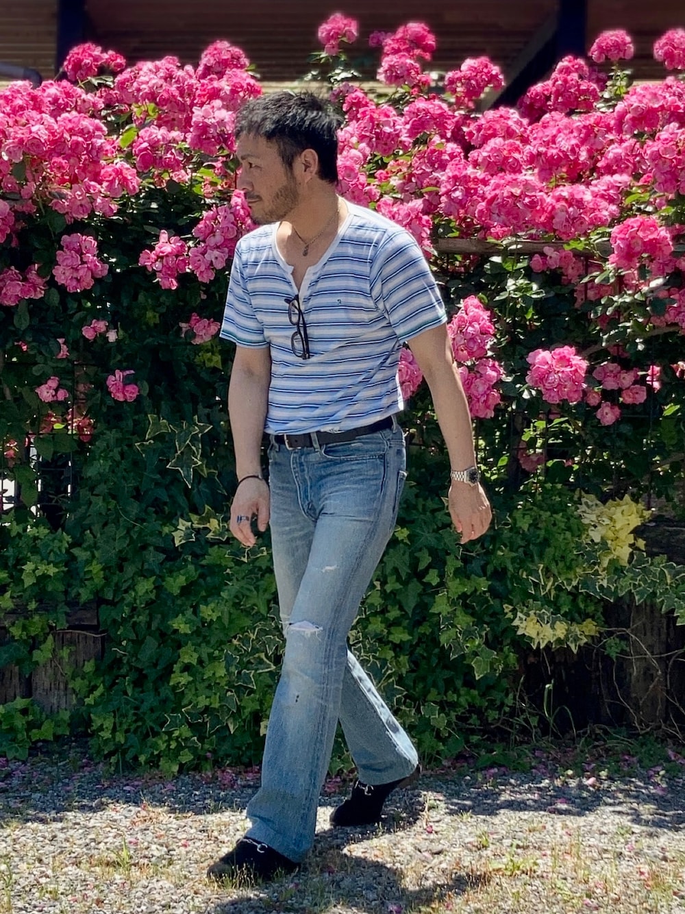 5月23日 昼 29/17℃ カジュアルスタイル 古着のTシャツにダメージの入ったフレアジーンズ。 少しだけカジュアルアップするためブラックスエードのビットローファーを合わせました。 簡単に大人っぽくできるので一足持っておいて損はありません。
