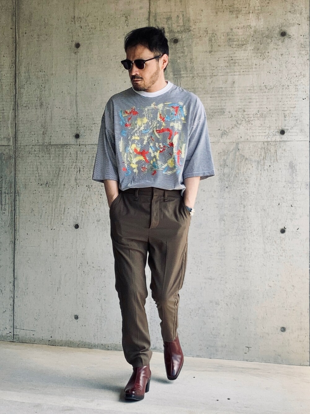 5月31日 昼 26/18℃ 柄Tシャツ スラックスとブーツを合わせることでドレス寄りに味付けしサングラスで仕上げました。 気負わない大人のカジュアルです。 ただし暑いです。