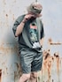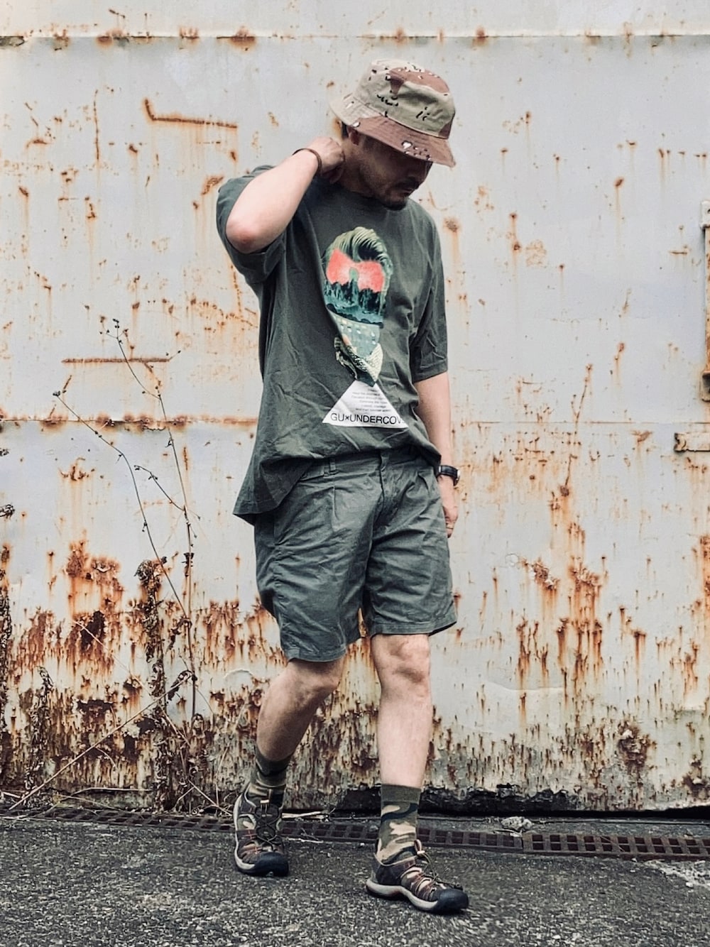 gu x undercover コラボTシャツ 2021年のコラボのわりに随分昔のことのように感じます。 ビッグな半袖の柄Tと短パンにサンダルという子供のようなアイテムでのワンツーコーデなのでとりあえず全体のトーンを統一しTシャツはフロントタックインでルーズになりすぎないように調整しました。 ハットを深くかぶることで顔と服装のギャップを埋めているのもポイントです。 今日は日中30℃あったので涼しさ優先ですが襟なしの半袖半ズボンスタイルはかなり難しいですね。 欧米人が上下ともビッグシルエットのワンツーコーデをするとカッコよく見えるのですが自分がやると服に着られてる感たっぷりで違和感を感じます。 体づくりを頑張るしかない!