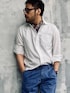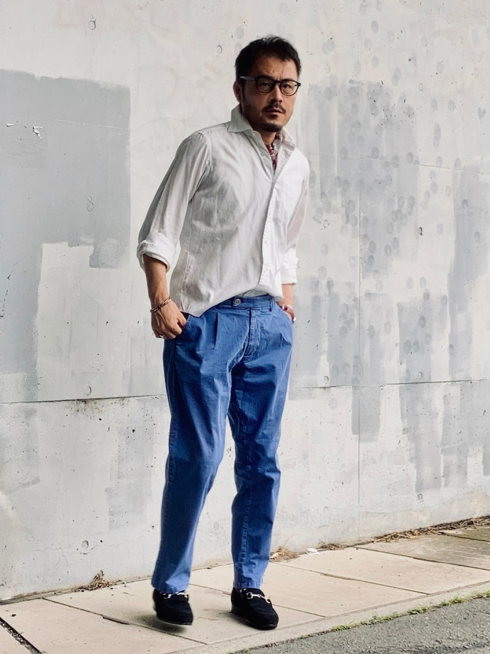 7月4日 午前 26/24℃ ドレススタイル ベルウィッチ🇮🇹の真っ青なパンツを古着屋のセール品(1500円)で手に入れました。 真っ白なシャツと合わせて夏の空と雲をイメージ。 更にスカーフと腕時計、ソックスに控えめな赤を入れてトリコロールに。 大人っぽく仕上げています。 このスタイルを改めて見るとちょっと地味に感じる。 小物で装飾しているもののどこか古い。 柄シャツにするかゆったりサイズにするか、もしくは派手なバッグを持つか…