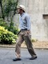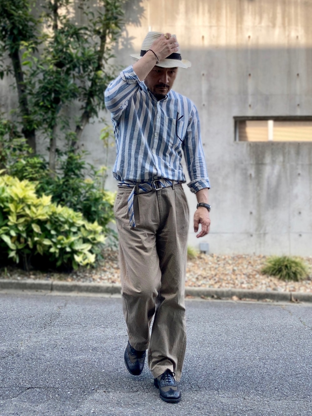 トラッド風 コットンリネンのストライプシャツに使い込んだコットンワイドパンツ。 あまり使ってなかったリングベルトもシャツのストライプとのマッチで久々の登場。 麦わらは夏の避暑としてもはや私の必需品です。 全体を通して見ると色の明度と彩度を落とした控えめな合わせ方で気だるい感じが高温多湿な環境に合っているかなと思います。 おじさんスタイルですけどね、気張らない楽な格好が好きなんです!