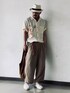 かりゆしをドレスライクに着る タックインしてリネンパンツと合わせました。 シャツの柄とベルト、スカーフに赤の差し色を控え目に入れて整えました。 パンツをロールアップして足首をもっと見せたかったのですが歩いているうちに素材の自重で元に戻ってしまうので諦めました。 でもそのお陰でちょっと変わったシルエットの写真が撮れたから結果オーライ! それにしてもハットと柄のオープンカラーシャツのコラボは中南米の売人っぽくなってしまう…