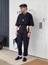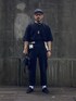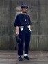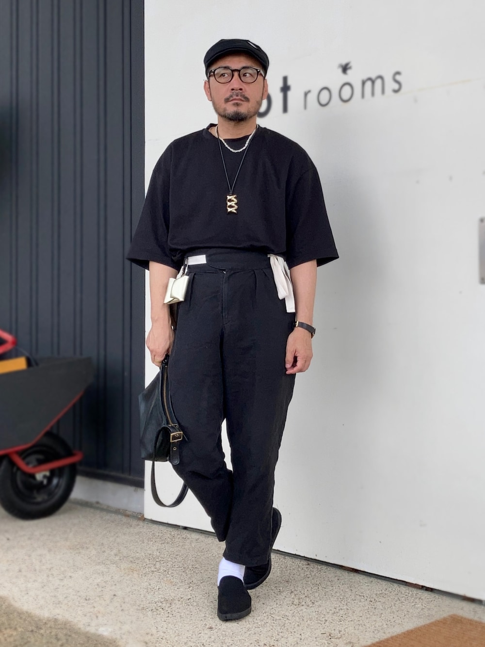 Xラインシルエット パンツ付属の白い布紐ベルトでウエストマーク。 ちょっと特徴的なシルエットで洋装でもわずかに和を感じられる着こなしです。 アクセサリーや小物の金具類はゴールド。 真っ黒なスタイルに変化をつけています。