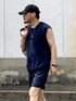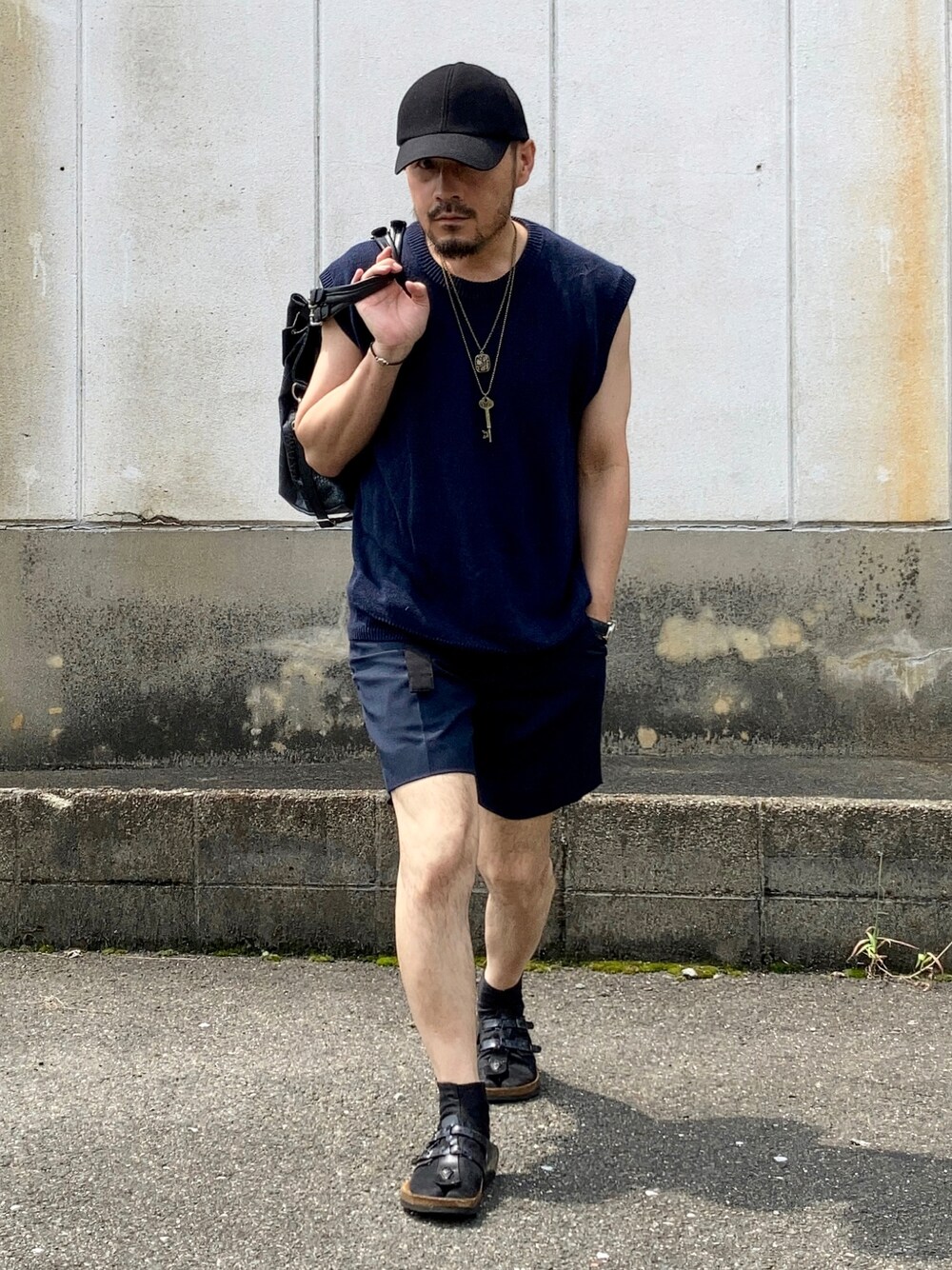8月15日 午前 34/26℃ 露出 ファッションに年齢は関係ないと言いつつも限界は確実にあります。 その限界に挑戦したのが今回のコレです。 露出面積が大きい分はネイビーワントーンの配色とニットベスト&スラックス素材のショーツのドレス要素で相殺したつもりです。 足元は足袋とサンダルで差別化。 ベストはリネン素材のニットなのでサラッとして快適です。 やはり夏は夏素材を使う気限ります。