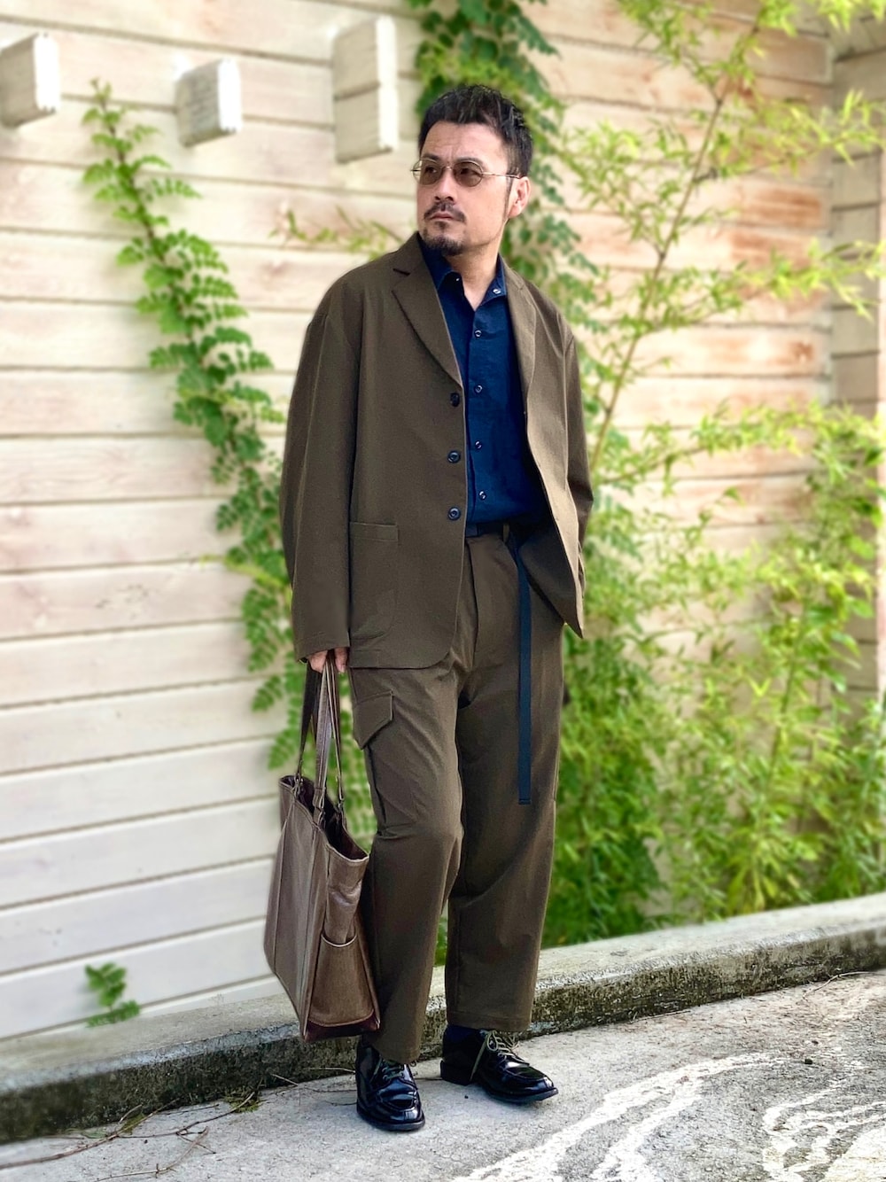 9月7日 朝 24℃(32/24) セットアップ 3釦パッチポケット&カーゴパンツのカジュアルなセットアップ。 ワークシャツとミリタリーダービーを合わせてタフに仕上げ。 モダンアミューズメントのセットアップはストレッチが効いてデザインだけでなく着心地もカジュアル。