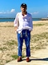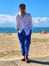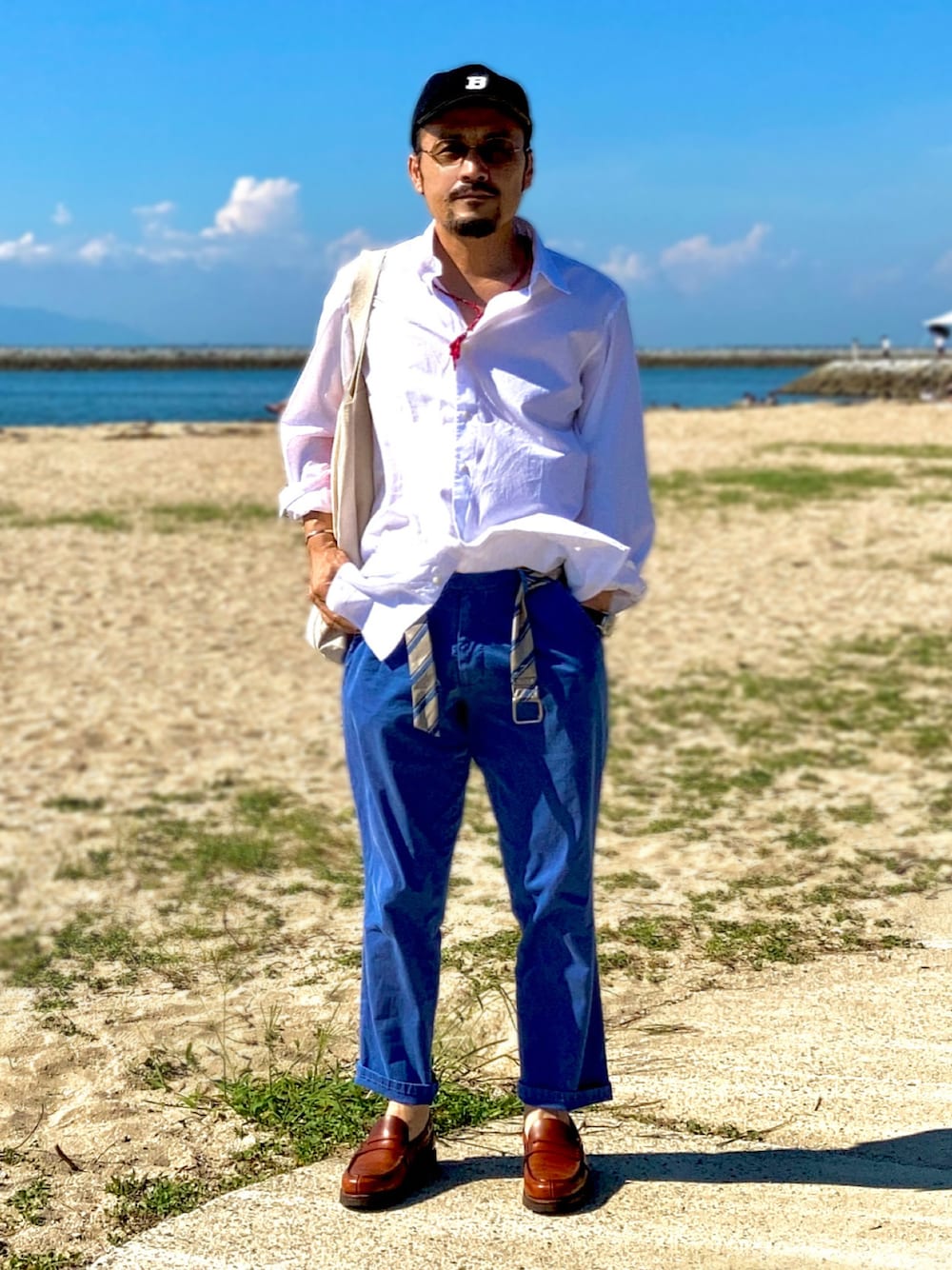 9月11日 午後 32℃(32/24) シーサイドスタイル 海を目指してドライブ。 海と空の色を意識した配色、シャツのボタンを大きく開けベルトを閉めずに垂らすだけのカジュアルな着こなし。 いい気分転換になった!