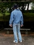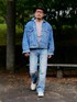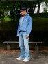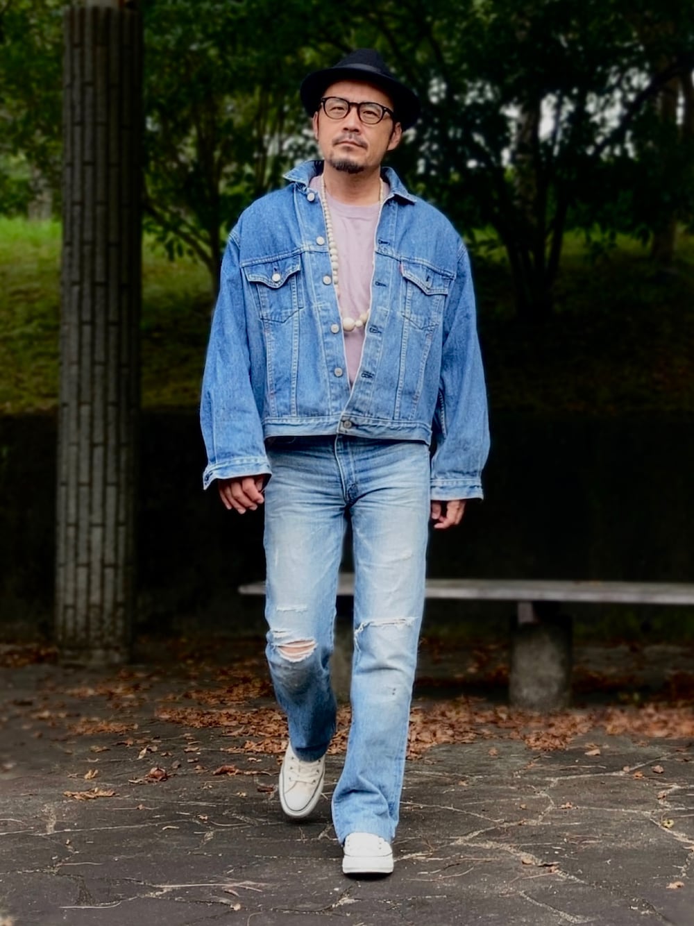 9月17日 午前 28℃(30/25) デニムonデニム 上下とも古着。 ジャケットはオーバーサイズと抜き襟の合わせ技でシルエットを作る。 パンツはフレアとダメージでトレンドライクに。 オールスターのハイカットを合わせたカジュアルルックをウールハットでカジュアルアップし街着に適応。 木製ネックレスで差別化。