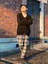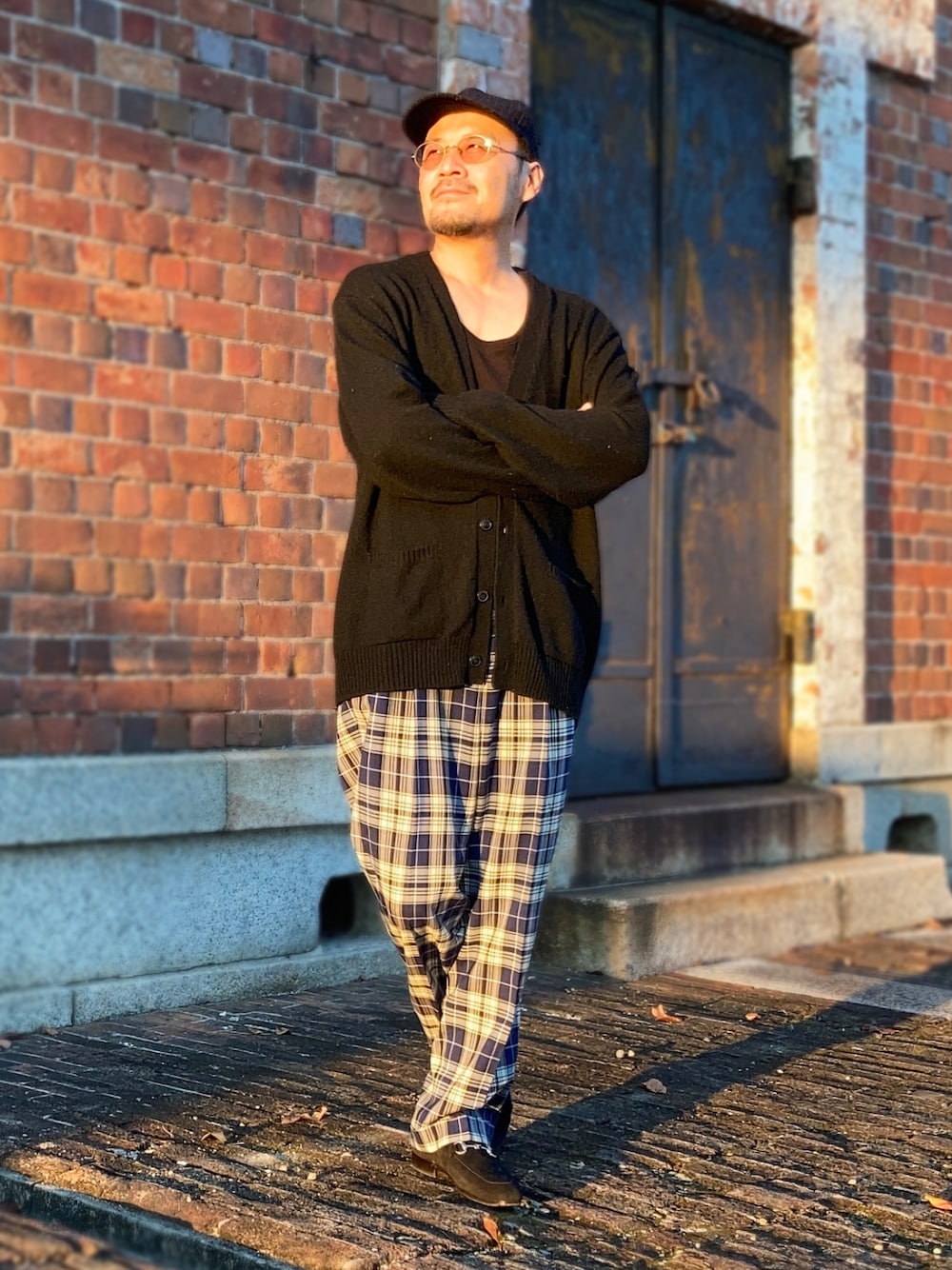 GUのカーディガン 2-3年前のモデル。 サイズアップして着用。 もちろんチェックパンツが主役だがそれを活かすのは脇役。 カーディガンとスエードのビットローファー、ウールキャップの起毛3アイテムで先端(頭、手首、脚元)固め。 パンツが夏素材なので脇役は季節感のある素材をチョイス。 夕方5時過ぎの撮影だったため夕陽の光で写真の色味が黄色く染まりこれがまた秋っぽい。