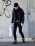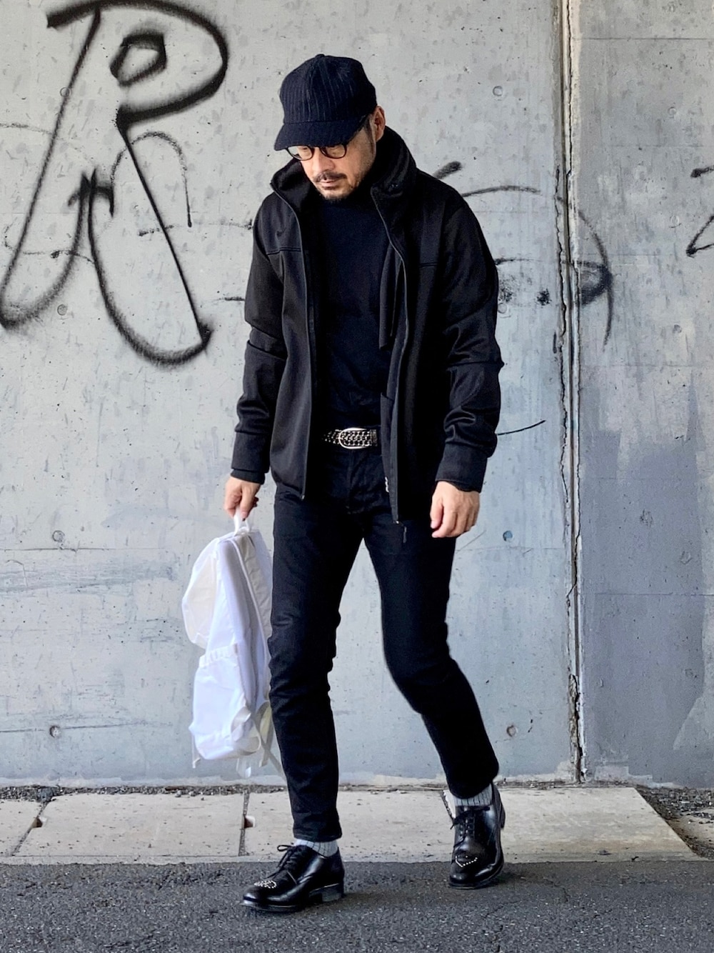 10月24日 昼 21℃(22/13) テック系アクティブスタイル 久々のスキニー。 ビッグ&ワイド以外は服じゃないと言わんばかりの風潮に一矢報いたい。 今日の服装はリユースが中心なので地球環境に優しいし何より十分オシャレとして成立していると思う。 専門店ではないところから使えるアイテムを見つけ出すのはかなりの労力と審美眼が要るのでおすすめはしないが一度味をしめるとやめられなくなるのも事実。 これまで服の価格にはほとんど触れてこなかったが実態はこう。 インナー:リユース 800円 アウター:リユース 500円 ベルト:リユース 300円 バッグ:リユース 500円 キャップ:リユース 500円 以下は新品購入 ジーンズ:G-STAR RAW 12k円 シューズ:HIROSHITSUBOUCHI 60k円 メガネ:Jin's 13k円 ◆着こなしのポイント ブラック一色は退屈なので金属メッシュのベルトと革靴のスタッズで装飾し白のバックパックで明るさを加えている。