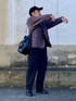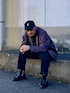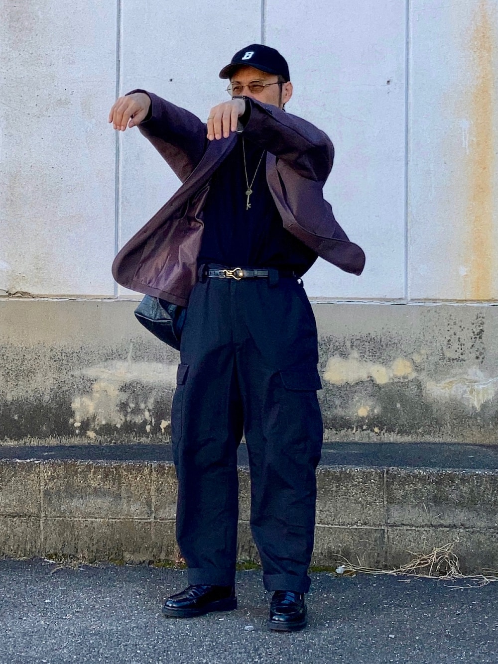 おばけポーズでWEARハロウィン2022 おばけポーズをあまり見かけないので再度参戦。 これで3回目なので堂々とポージングして撮影できた。 着こなしテーマはちょいワルおやじ。 パープルのジャケットのラペルを立ててラフな印象に。 ワイルド過ぎないようにロゴキャップで外している。