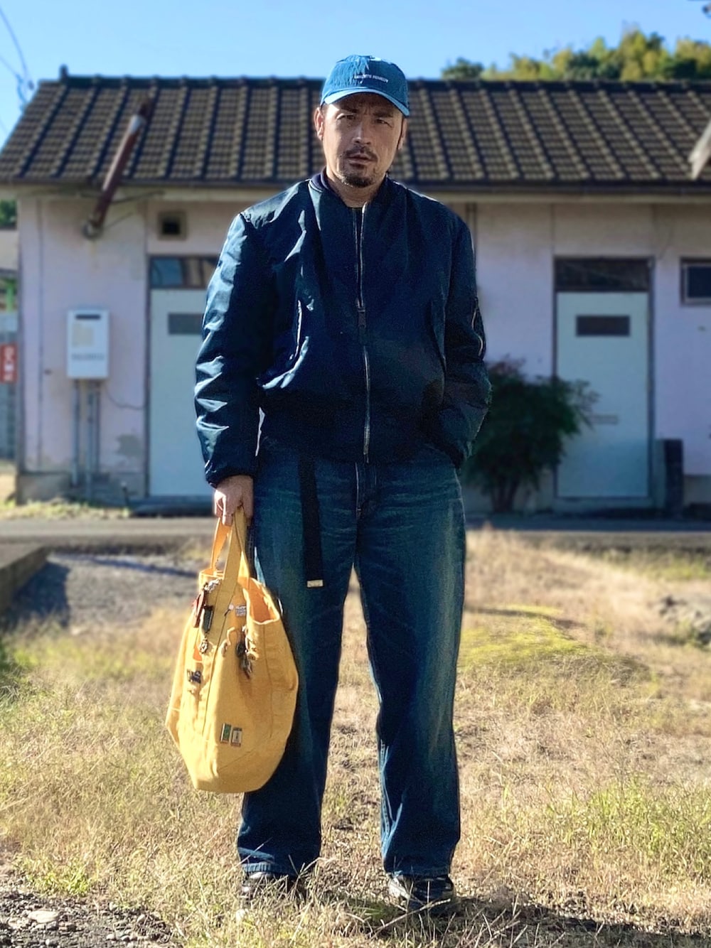 11月初旬 午前 14℃ 古着MA-1 前回着たWEGOと違いこちらalphaのma-1は本格派。 かなりクオリティの高いUSA製レプリカ。 経年変化したナイロンの質感に惹かれて購入。 カーハート100周年モデル(1989年)のデニムペインターパンツを合わせワークミリタリースタイルに。 インナーはドルガバのニットセーター。 何箇所も虫食い穴やほつれがあって良い感じにボロい。 大型のキャンバストートはフィンランド製時代のマリメッコ。 ピンズやバッヂをつけてカジュアルにカスタムしている。 今回のようなダークトーンのコーデの差し色にちょうど良い。 キャップとシューズ以外はすべて古着で構成。 ニット: 700円 ma-1: 3980円 パンツ: 4400円 トート: 3000円 ユニクロ・GU並みの価格でフルコーデ可能。