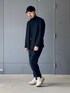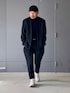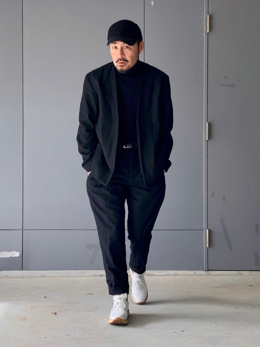 12月初旬 午前 10℃ (12/5℃) ウールで武装 冬はウールなどの天然素材を着たくなる。 ノーカラージャケットとスラックスをキャップとスニーカーで外す定番&シンプルスタイル。 上下別ブランドだがたまたまウールの質感と黒色の色味が一致したのでセットアップとして着用。