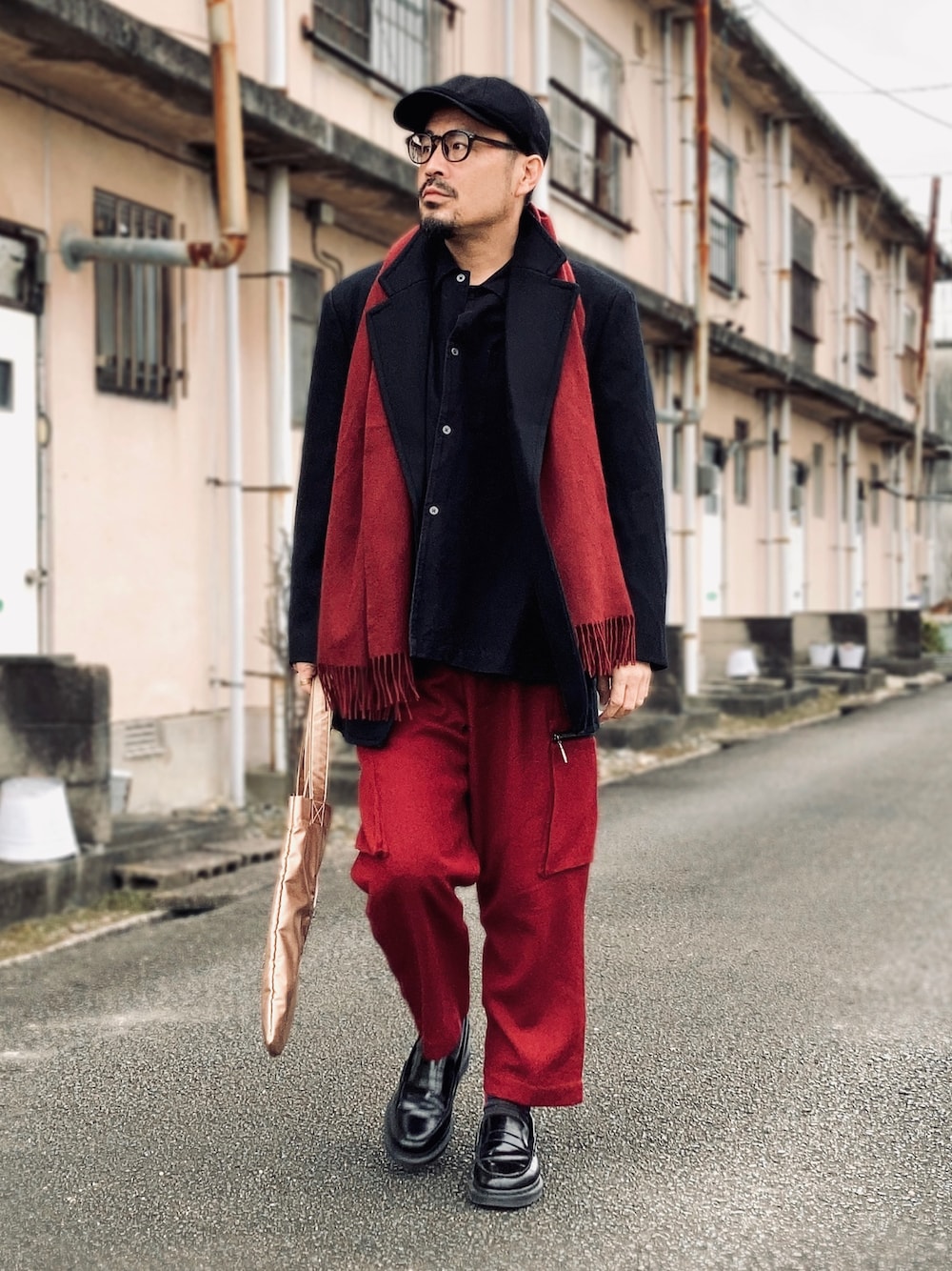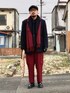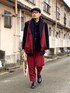 12月中旬 午前 6℃(8/2) スカーフonアウター ジャケットの上にスカーフ(マフラー)を掛けたレイヤードスタイル。 天然素材の起毛感で素材を統一し、レッドとゴールドカラーを入れてクリスマス仕様に。