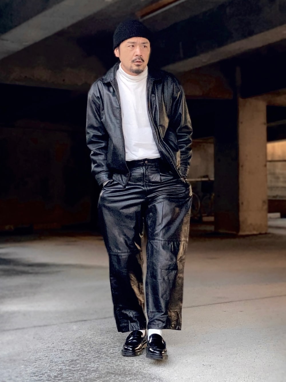 1月中旬 朝 8℃(14/7) レザーアイテム 牛革ブルゾン&牛革パンツ 上下レザー。 先日、古着のレザーパンツを手に入れ早速コーディネート。 上下古着だがサイジングやシルエットを慎重に整えているため自画自賛のスタイリング。 古着はうまく組み合わせると達成感や満足感を存分に味わえるのでやめられない。 ◆着こなし ハードなアイテムも白を入れるとバランスがとりやすい。 タートルネックで紳士的な印象を与えタフネスとインテリジェンスをバランスさせている。 ショートアウターとワイドパンツでXラインを作っている。 ◆ユニクロでじゅうぶん? 基本的に私は他人のために服を着ている。なのでこのタフな上下レザーコーデですら多くの人にはダメ出しされないだろうと思っている。 (間違っているだろうか?) TPPO前提でオシャレはもっと自由でいい。 自分の胸に手を当てて考えてみるとわかるが人は他人の服装がオシャレかなんてほとんど気にしていないし気にもならない。 でもダサい(TPO外れ・不潔)は一瞬で察知する。 “きれいめ“とか”女子ウケ”と言われるスタイルは突き詰めると“特別オシャレじゃなくても嫌われなければいい”というだけのものだから「量産型」「ユニクロでじゅうぶん」などという名言(?)が生まれている。 ダサくなければそれでいいのだろう。 私は服好きとしてそれくらいでは満足しないのでもっと自由に、今回のような上下レザースタイルも楽しみたい。 ”ダサい“と“どうでもいい”の間の嫌い直前の限界点にこそオシャレが存在するのかもしれない。