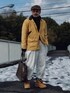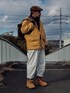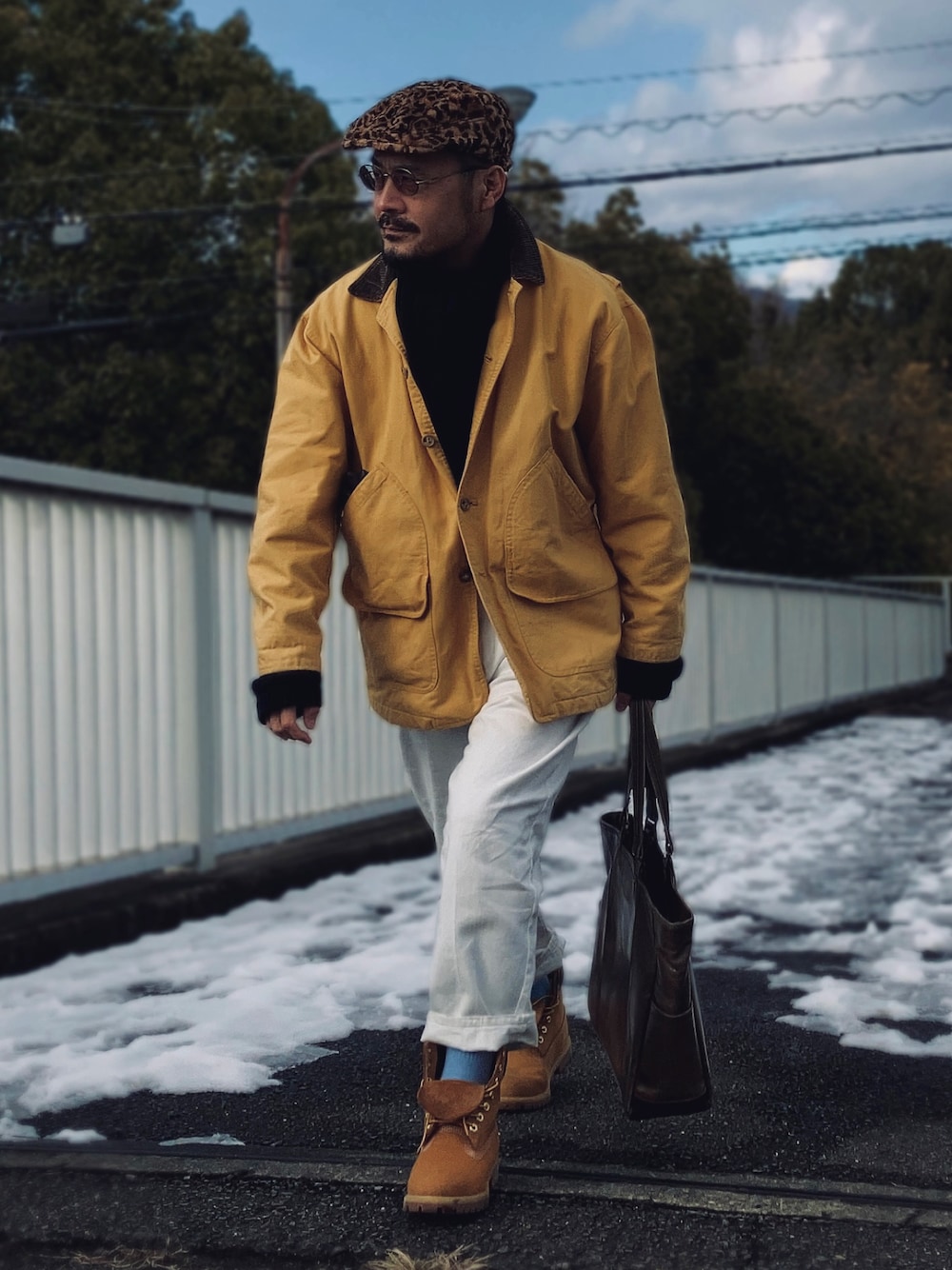 1月下旬 午後 5℃(5/-1) 古着ワークスタイル 日本製古着の使い込まれたカバーオール。 まだ雪が残る歩道橋をティンバーランドのイエローブーツと一緒に歩く。 きれいめに対極するワーク的な男っぽいスタイルは力強さや包容力が感じられてTPOに上手くマッチすると抜群にかっこいい。 私の着こなしはただの真似事。