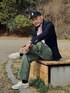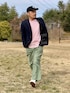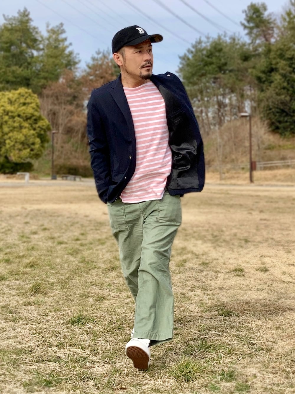 3月上旬 午後 15℃(15/2) 春コーデ ピンクボーダーのバスクシャツにベイカーパンツとキャンバススニーカー、そしてキャップ。 あまりにカジュアルなのでテーラードジャケットを羽織った。 風の強い日でジャケットがめくれているが裏地がキュプラなので高級感が感じられる。 こういう見えにくいところにも素材の恩恵がある。