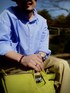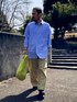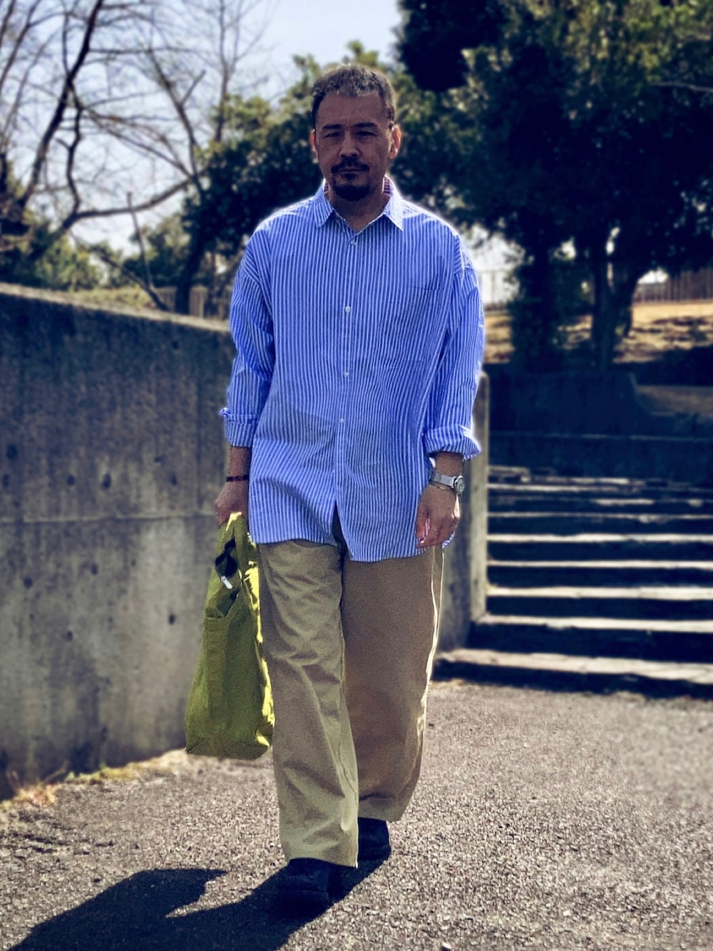 3月中旬 午前 16℃(20/7) 春服 ブルーストライプシャツにベージュチノ。 アップルグリーンのバッグで春らしい装い。 普通のアイテム。 ただサイズやデザインを僅かに崩したアイテムで構成。 ワイドパンツを穿いているがオーバーサイズのシャツを出して着ているので変形Iライン。