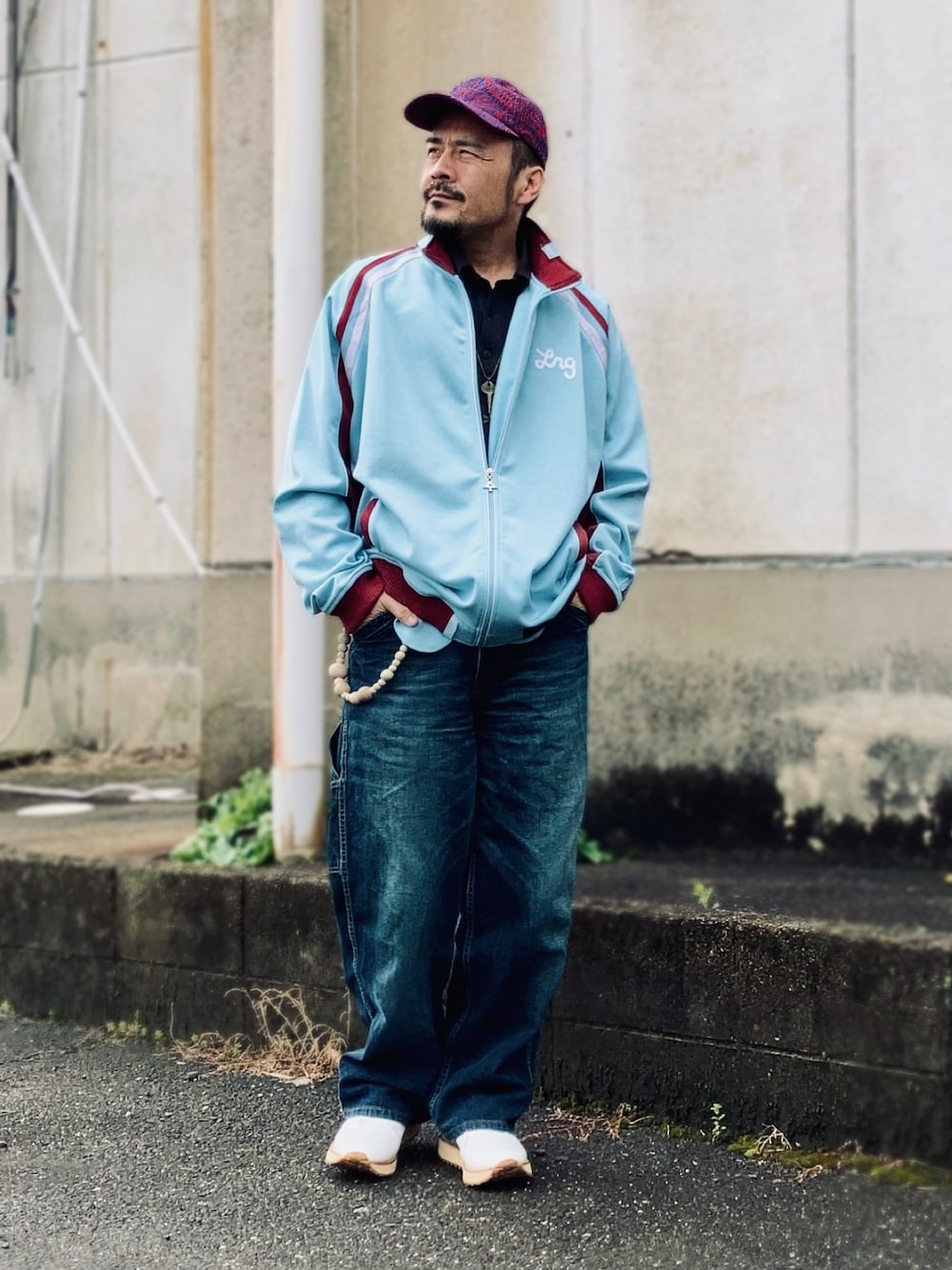 3月中旬 昼 12℃(13/8) トラックジャケット きれいめスタイルへのカウンターパンチ的ファッション。 今回はブランドもジャンルも関係なく着たいものを着ている。