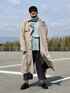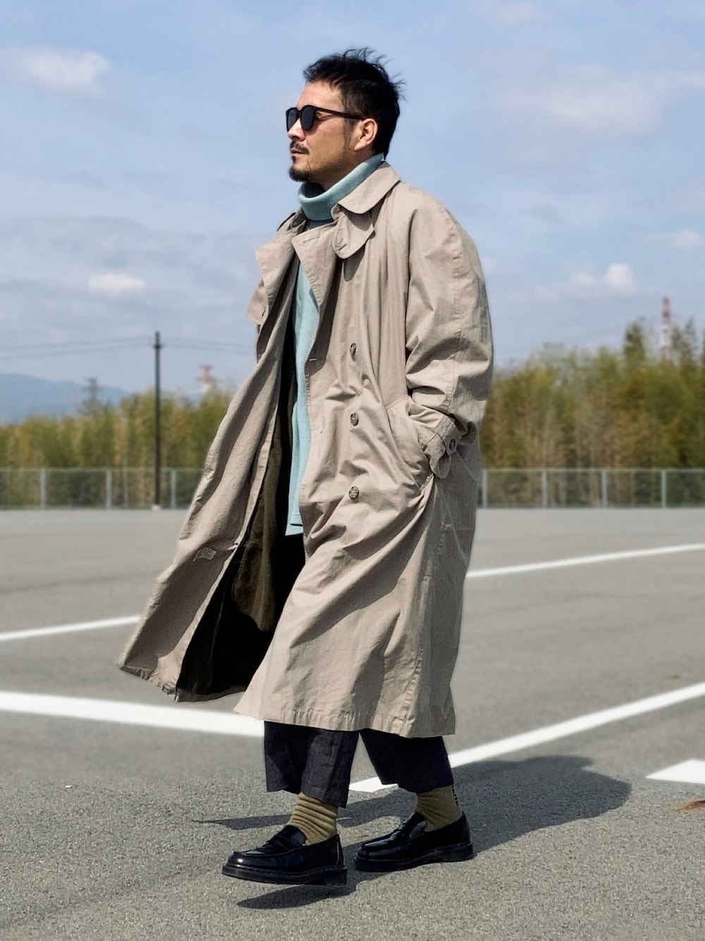 4月上旬 午前 17℃(21/11) 古着トレンチコート コートもスラックスもざっくりラフに。 クロップド丈のワイドパンツで敢えて短足に見える着こなし。 古着中心の場合、オシャレとは縁遠い男くさい世界観が似合うのでこれでいい。 脚長に見せるだけが正解ではない。 サングラスをかけると全体が締め上げられてまとまる。