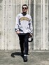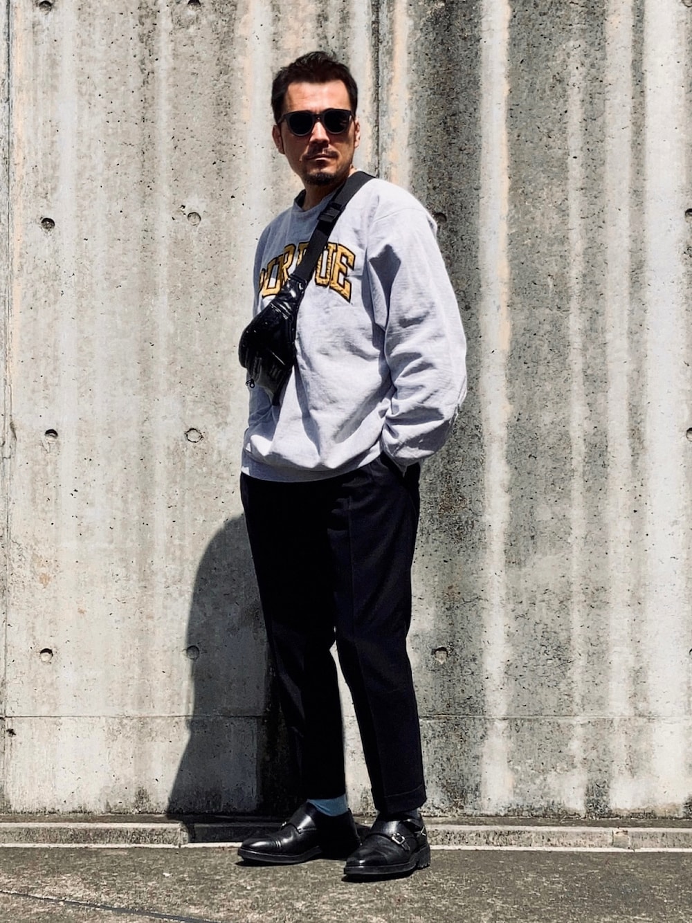 4時中旬 昼 20℃(22/8) 古着スウェットシャツ アラフィフがロゴスウェットを着るのは結構リスキーで、とっちゃん坊やっぽくなりがちなのでモノトーンの配色を基調にボトムスはスラックスと革靴でまとめ。 このくらいでようやくサマになる。 古着のこなれ感も効いているかもしれない。 シンプル過ぎないようにボディバッグとサングラスをアクセントにしている。